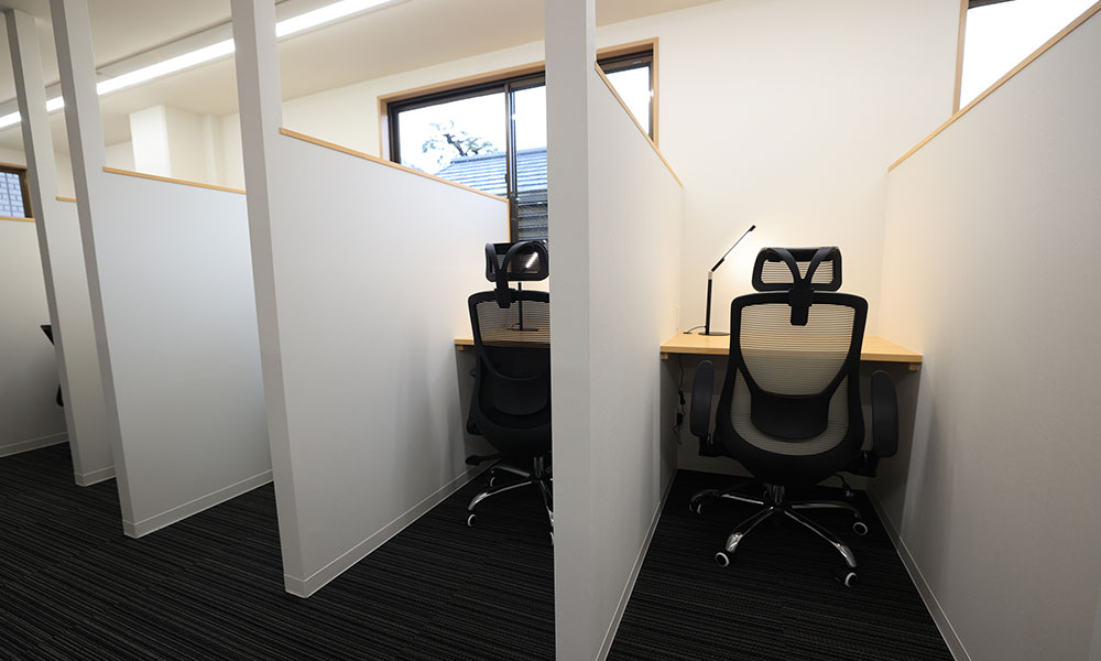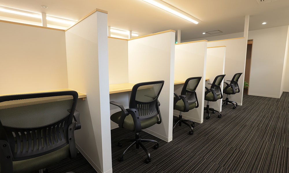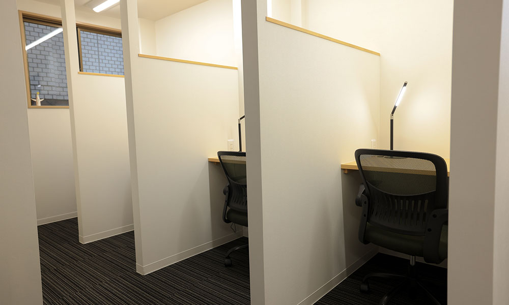 ワイド約80cm、奥行き約60cm、パーティション高さ約150cmの集中ブース(位置により多少の差異がございます)。卓上照明、電源2カ所を配備しております。